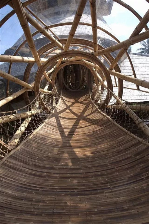 別墅的入口經過一個非常具有戲劇性的隧道連橋,之后直接進入到露天起居室及餐廳。戲劇性的空間讓它可以稱得上為一座奇幻主題樂園。